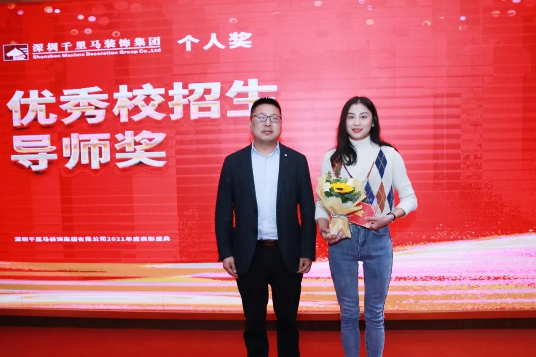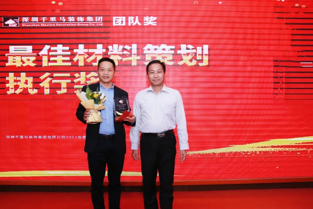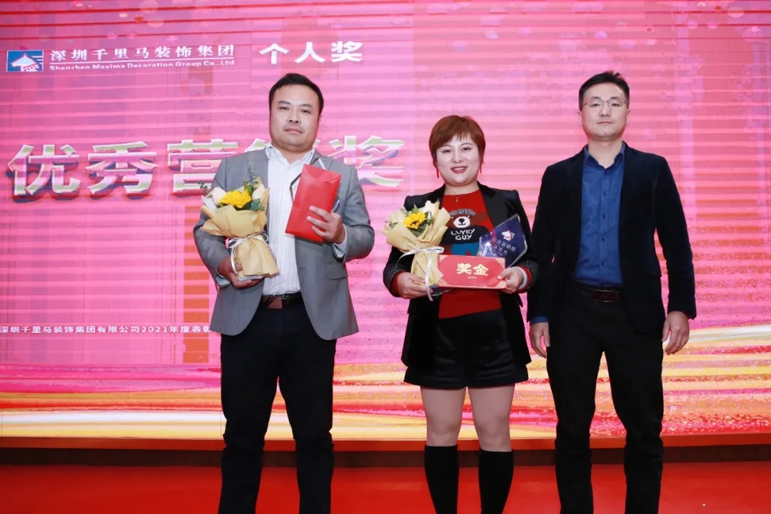 隨后,千里馬裝飾李向東董事長、李文學總經理、朱建國副總經理、丁利斌副總經理等領導分別為2021年度優秀團隊及個人進行了表彰頒獎,這其中有公司的新人,也有見證公司歷程的元老,更有一批與公司長期同發展、共進步的項目管理人員,現場全體人員為他們獻上了最熱烈的掌聲,感謝他們為公司創造的卓越成績,鼓勵他們為公司做出更大貢獻。
