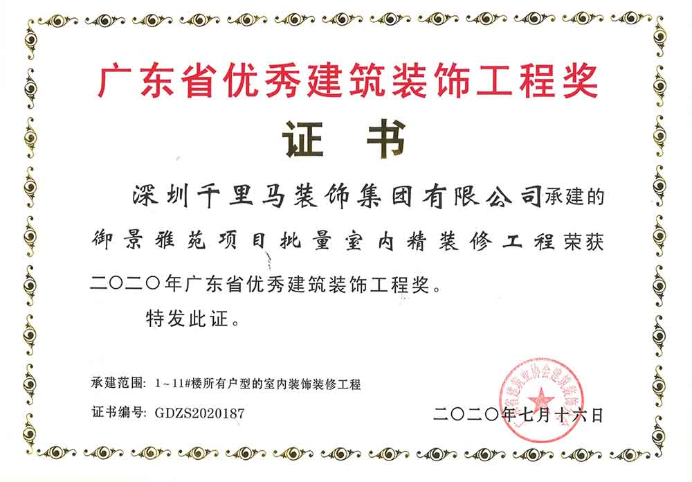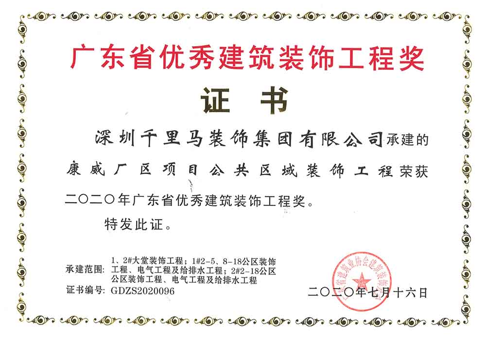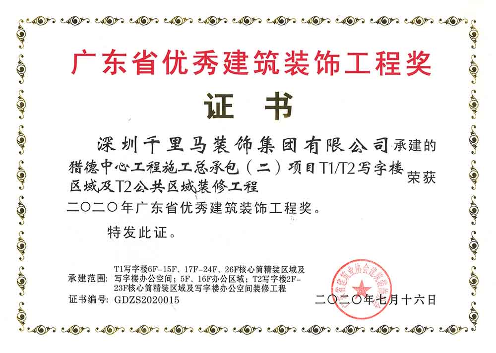 近日,由深圳千里馬裝飾集團承建的廣州獵德中心寫字樓、深圳創新智慧港寫字樓、東莞御景雅苑等項目紛紛榮獲2020年廣東省優秀建筑裝飾工程獎。