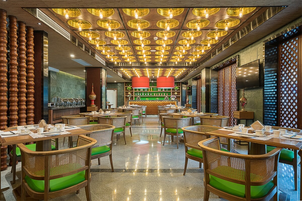 全日制餐廳,座椅選用泰式經(jīng)典藤椅,和同色系的竹桌相結(jié)合,給人一種置身于林間木屋的感覺。天花吸頂燈采用金色燈罩,和大堂色彩搭配一致。餐廳兩側(cè)配有泰式陶瓷藝術(shù)擺件,在細(xì)致的地方體現(xiàn)泰式風(fēng)格。餐具選用了簡潔古樸的白瓷,放在簡單的竹桌上,給人一種回歸自然、感受寧靜的感覺。。