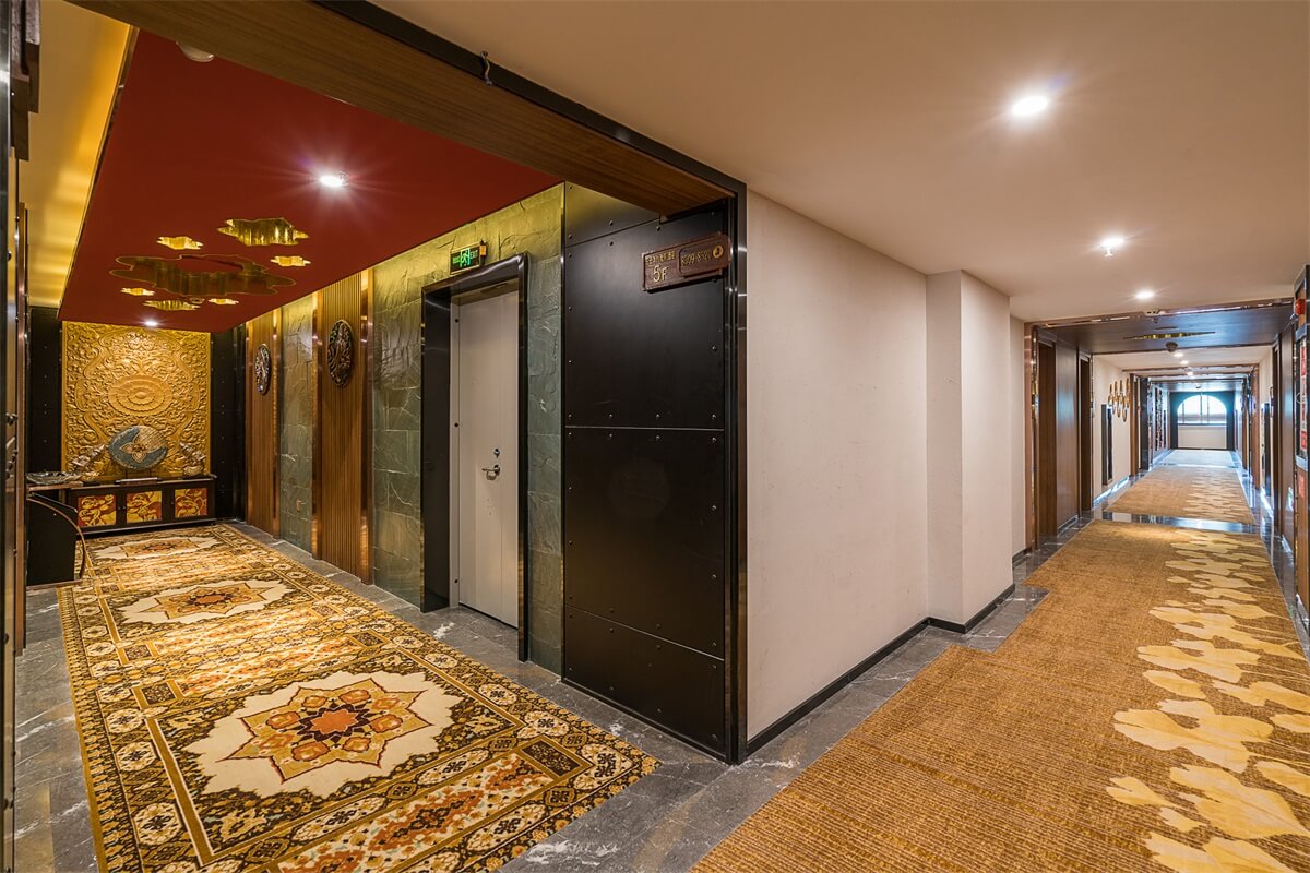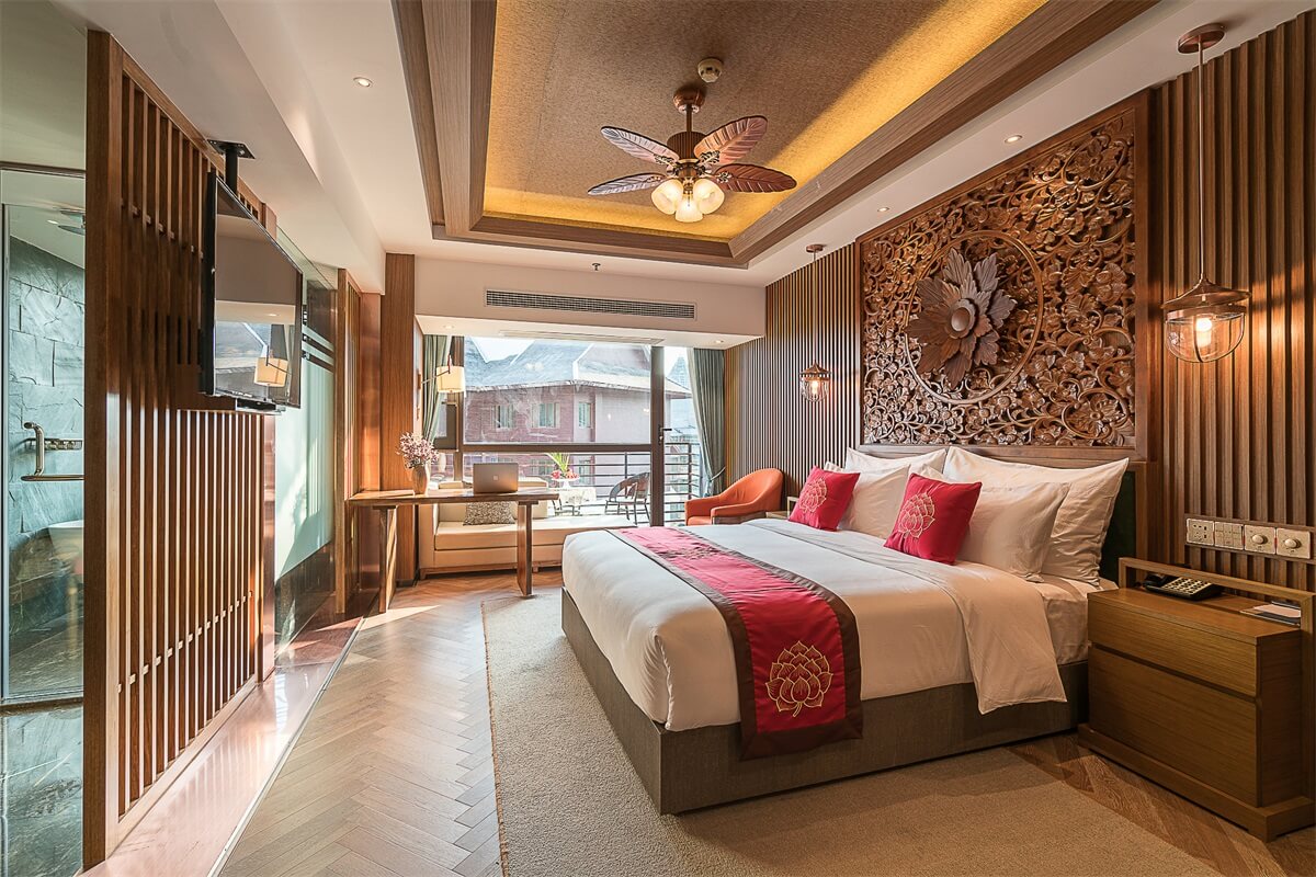 在電梯廳的設(shè)計上,紅色的天花、金色的墻體、金色的地毯,和整個酒店的泰式風(fēng)格相輔相成,在邊幾上擺放富有泰式風(fēng)情和佛教感覺的金色擺件,給人一種驚喜的感覺。在客房的設(shè)計上,地板、沙發(fā)、茶幾、屏風(fēng)、吊燈、臺燈、背景墻等都采用木材作為原材料,地毯則選用淺色系,給人回歸自然的寧靜感。